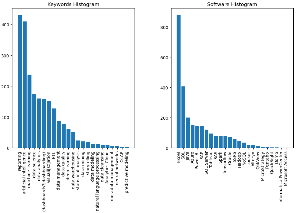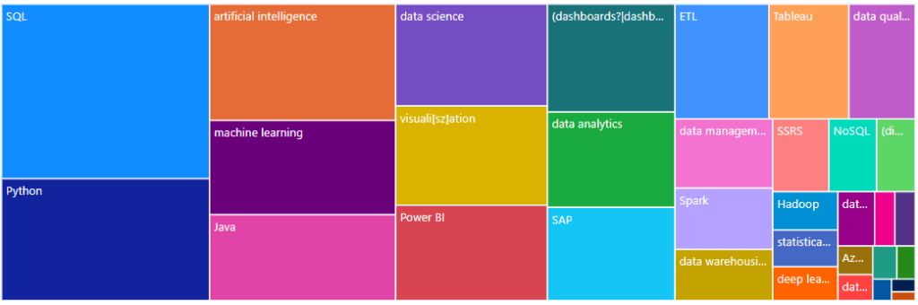 #Keywords = ['SAP', 'Analytics Cloud', 'Excel', 'Azure Synapse', 'Power BI', 'Tableau', 'SQL', '\bR\b', 'Python', 'Java', 'data mining', 'ETL', 'data warehousing', 'data modeling', 'visuali[sz]ation','business intelligence', '(dashboards?|dashboarding)', 'reporting', 'OLAP', 'data analytics', 'data science', 'machine learning', 'deep learning', 'neural networks', 'natural language processing', 'Tensor flow', 'artificial intelligence', 'predictive modeling', 'statistical analysis', 'data cleansing', 'data quality', 'metadata management', 'data management', 'Hadoop', 'Spark', 'NoSQL', 'SSRS']