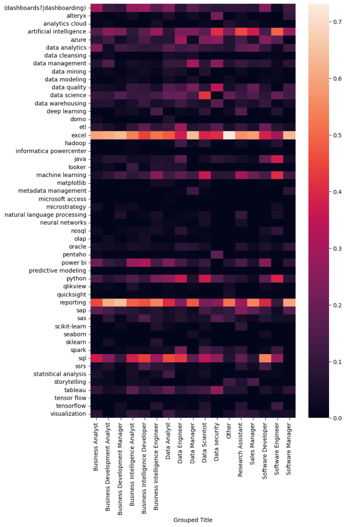 Then I used a heatmap to visualize the common associations between the keywords found in the job descriptions and these 16 job titles. I was particularly interested in any unique features on the vertical axis which would set one category apart from another.