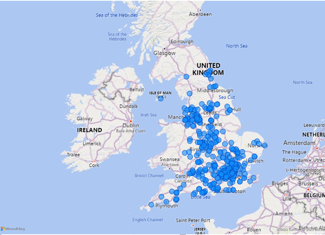 As you would expect the jobs are focused around the cities in England. We can see some clustering around the top 3 largest cities in the England; London, Birmingham and Manchester.