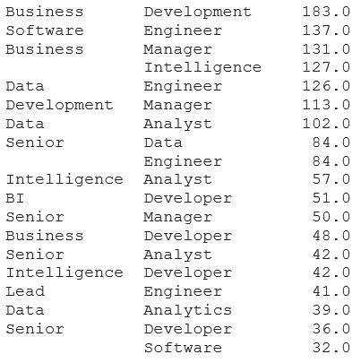 Next I wanted to explore whether or not there are any associations to be found between these specific keywords and the respective job titles. The problem here is that there were 1554 unique job titles, so I needed to refine these into a more manageable number of ‘job categories’. To find out what these categories should be, I looked for patterns in the job titles. First I identified the most common words extracted earlier: