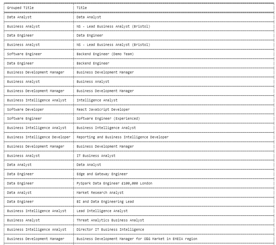 Using this information I generated 16 job titles and used a package in python to sort the 1553 unique job titles into each of these (and other for those which did not meet the similarity threshold). The process was not perfect, but it was good (and saved me trawling through 1553 job titles!). Here is a snippet of the output:
