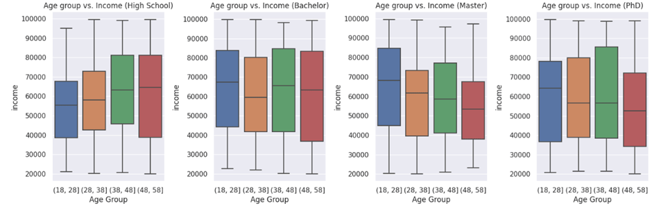 I continued by taking a look at how income and spending vary between education groups, and age groups.