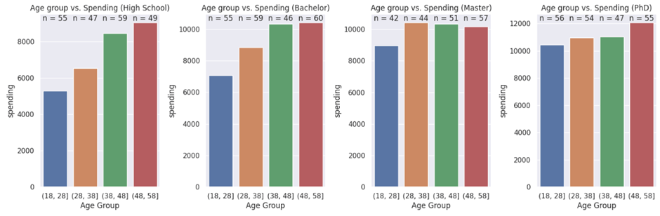 On the other hand, spending seemed to increase with age in 3 of the 4 education groups.