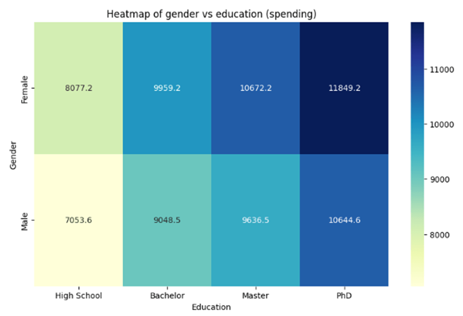 # Assuming you have a DataFrame named 'df' with columns 'gender', 'education', 'income', and 'spending'