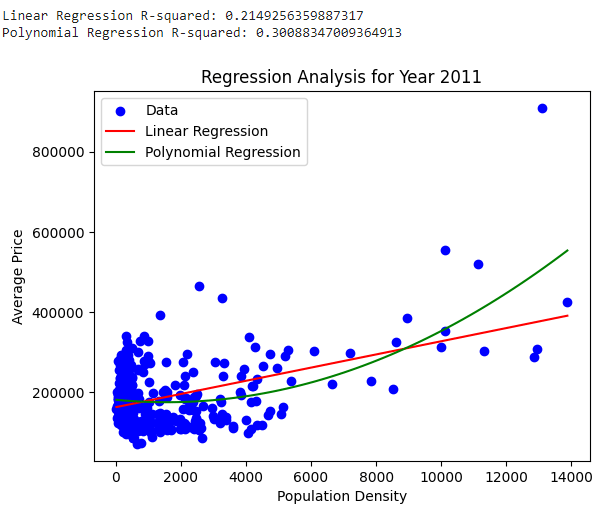 The R-Squared values for each year are quite low (0.17-0.31) indicating that although we see a positive correlation population density (both with the linear regression and polynomial) alone is a weak predictor of average house price.