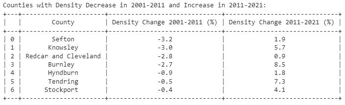 I was curious to have a quick look to see which counties have reduced in population density and/or average house price. Here are the results: